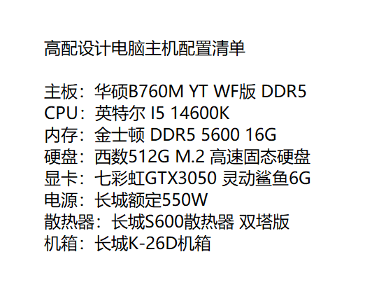 专为设计师、剪辑师、建模师打造的高配设计主机,硬核配置+稳定输出,让创意高效落地。搭载英特尔i5-14600K,14核20线程,最高睿频5.3GHz,多任务渲染、视频导出、大型设计软件并行运行流畅不卡顿。搭配华硕B760M YT WF版 DDR5主板,高速传输与稳定供电兼备,完美释放平台性能。