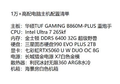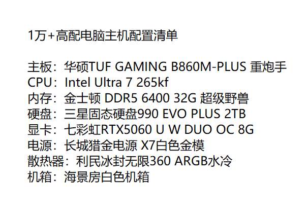 核心性能:Intel Ultra 7 265KF 20核20线程,睿频5.5GHz,AI算力强劲,多任务处理丝滑无压力 ;搭配华硕TUF B860M重炮手主板,12+1+2+1相80A供电模组,稳定输出+Wi‑Fi 7高速网络,军工品质耐用可靠 。